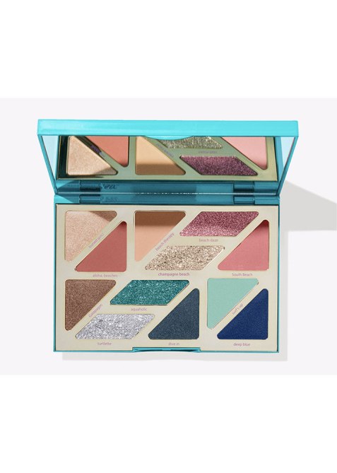 A 12-pan palette that includes 4 glitter and 8 creamy powder shades, including South Beach (matte melon) and Dive In (deep teal shimmer).