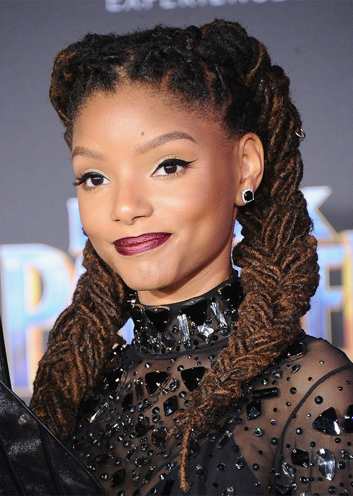 The texture of locs looks even more beautiful when intertwined into jumbo-sized pigtails.
