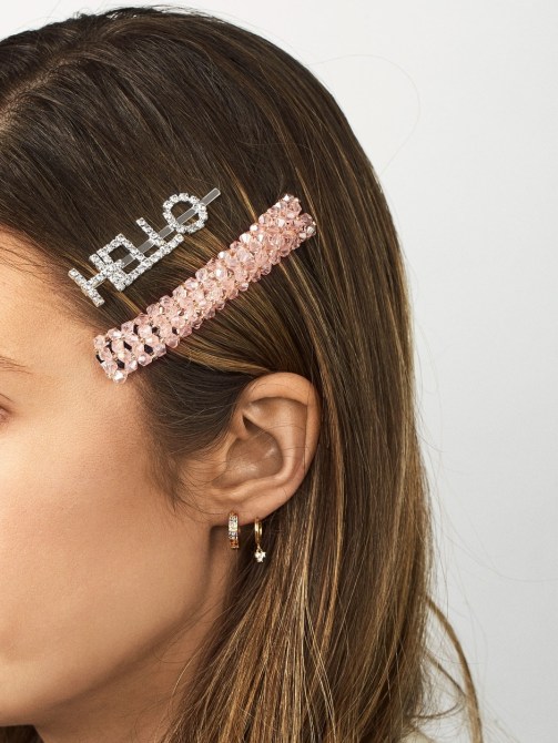A three-piece hair clip set makes stacking barrettes super easy. That crystalized ‘HELLO’ will definitely be in our next selfie shoot.