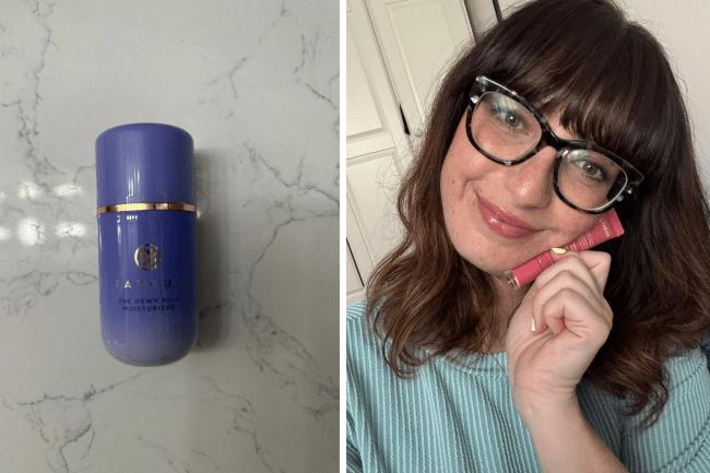 My skin has been going through it lately. Due to hormonal changes, I’m breaking out and dealing with an uneven complexion that’s also pretty oily but turns into a desert the second I apply foundation (think instant cakey-ness, a problem that I’ve noticed more and more now that I’m in my—gulp—mid-30s). Once I started using the Dewy Milk Moisturizer , that changed immediately, and in the photo above, you can actually see how freakin’ dewy and glow-y my skin looks with makeup on—and that’s thanks to the moisturizer. Yes, I’m wearing foundation and blush, but my skin doesn’t look dry!