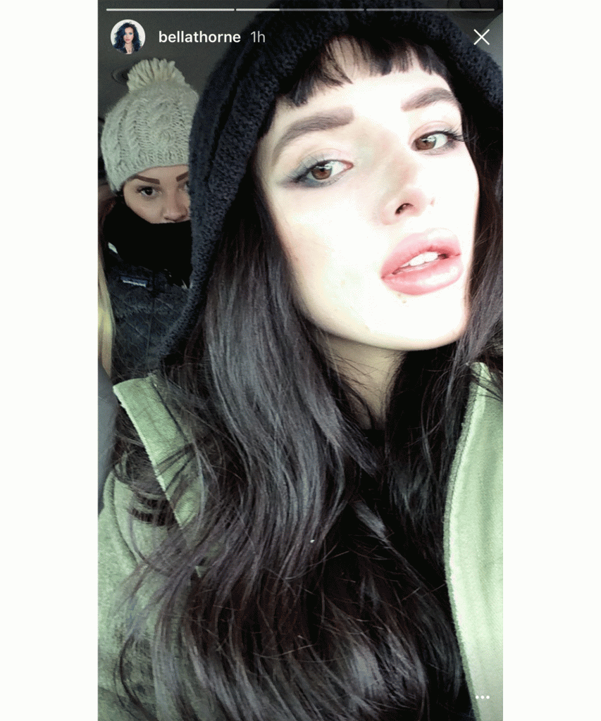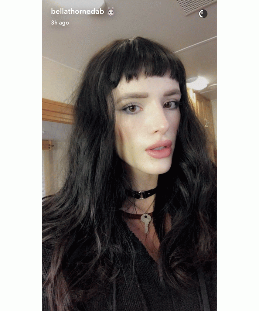 Last we checked, Bella Thorne was rocking long, blue hair. But she just debuted a whole new look on Instagram and Snapchat, featuring even longer hair—dyed black, complete with short, blunt bangs. “Little kiss for ya 😘,” she wrote on Instagram, puckering her lips and showing off her makeover.