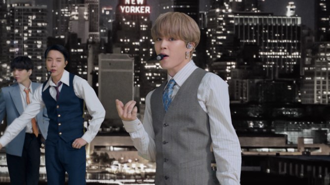 Their VMAs performance, which was their first televised performance of “Dynamite” since its release in August, started with the boys against a green screen of the Brooklyn Bridge before Jungkook went into his first verse. Dressed in snazzy suits and vests, the performance went on with the green screen changing to different New York City locations, including Times Square, where a giant billboard displayed the “Dynamite” single art (and an ad for the VMAs). The performance ended with BTS performing the chorus as fireworks went off behind them over New York’s skyline.