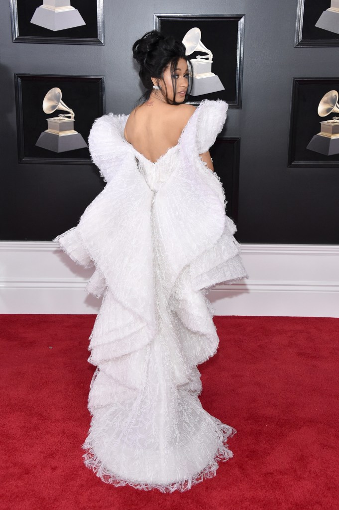 Check out that train! The detail on the gown is outstanding. The designer told InStyle magazine that the dresses Cardi B wore on the Grammy’s red carpet took 150 hours to make! It was about “two to three weeks” of work, he explained. “[We had] six main couture seamstresses working on it.” Wow! Talk about a time commitment. Well, it paid off. She looked amazing at the pre-Grammy Gala and the Grammys.