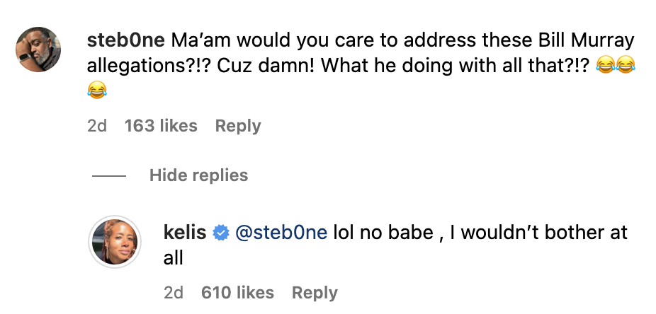 Are Kelis & Bill Murray dating? Not if her response to a fan question is anything to go by. On June 10, 2023, a fan commented underneath her Instagram post for that day: “Ma’am would you care to address these Bill Murray allegations?!? Cuz damn! What he doing with all that?!?,” Kelis responded, “lol no babe, I wouldn’t bother at all.” She later added: “Everyone’s dumb and will believe anything but the best part is we are both blessed, rich and happy.”