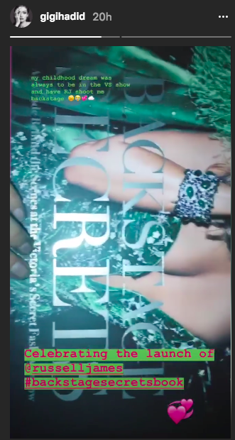 “My childhood dream was always to be in a VS show and have RJ shoot me backstage,” Hadid wrote. “Cuz we all know I’ve BEEN obsessed with @angelcandices. I grew up w some of the pics in this book!!!! They made me dream! And I used to do practice runway walks during VSFS commercial breaks.”