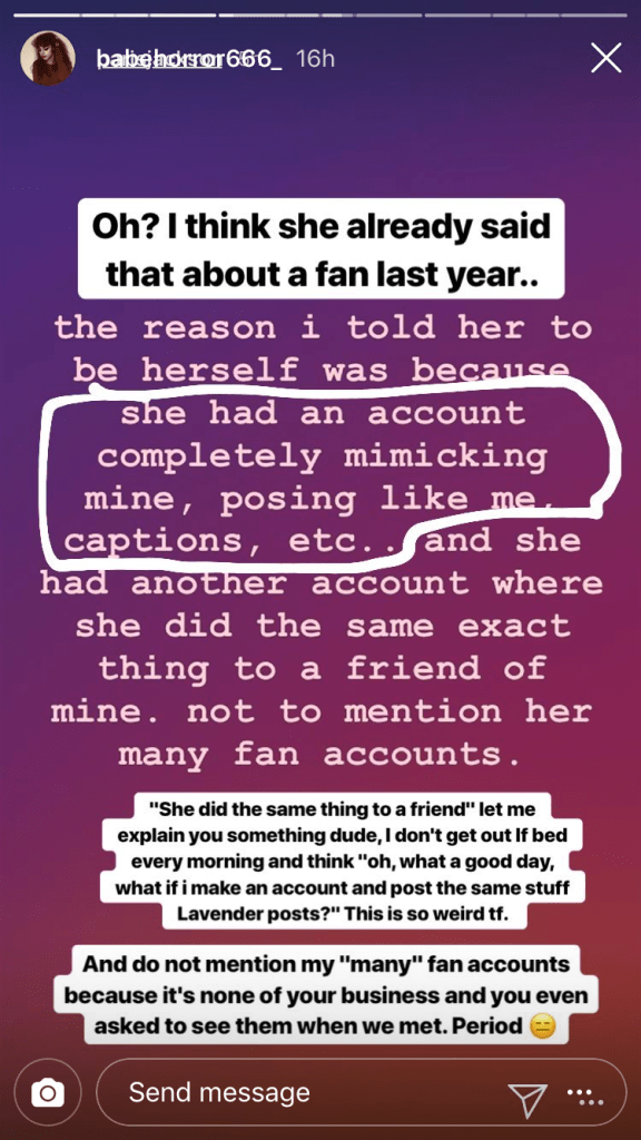 That’s when the fan responded, denying Jackson’s claim that she has an account dedicating to copying the model’s friend. The fan also denied Jackson’s claim that she “thanked” her several times, explaining that she apologize and offered to take the pictures down but didn’t thank her. The fan also called out Jackson’s friend, Lavender, for not confronting her herself and using Jackson to do it.