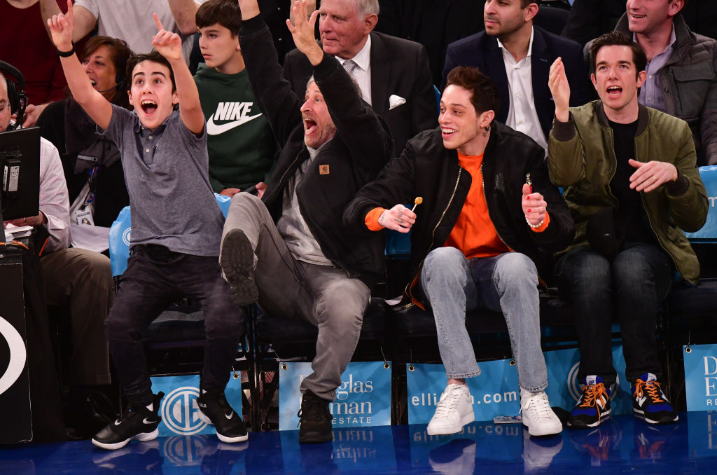 Nathan Stewart, Jon Stewart, Pete Davidson and John Mulaney attend Chicago Bulls v New York Knicks game at Madison Square Garden. Photo by James Devaney/Getty Images
