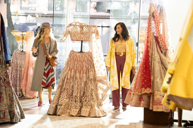 And now on a very special And Just Like That… Carrie Bradshaw learns about Diwali. Sure, Carrie has lived in New York for 200 years. In fact, she saw the Big Apple when it was a tiny little apple—that’s how long she’s been in NYC, yet somehow she is just learning about Diwali. I’m going to let that go…for now. Because we have more important matters to move on to. Specifically, did Carrie’s outfit pass the test. What test you ask? The Indian Aunty test.
