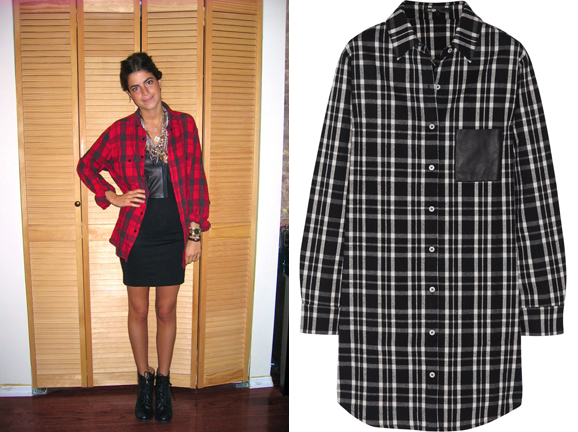 Right: Maje grunge leather-trimmed plaid flannel shirt ($215; available at Net-a-Porter).