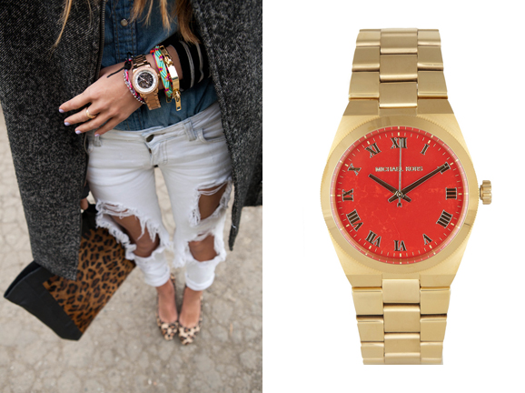 Consider a men’s gold watch the perfect starter piece to begin layering bracelets. This is an item you can and should wear everywhere. Don’t worry if the strap on the watch is a little too big for you—you can let the watch ride on your wrist like a bangle.