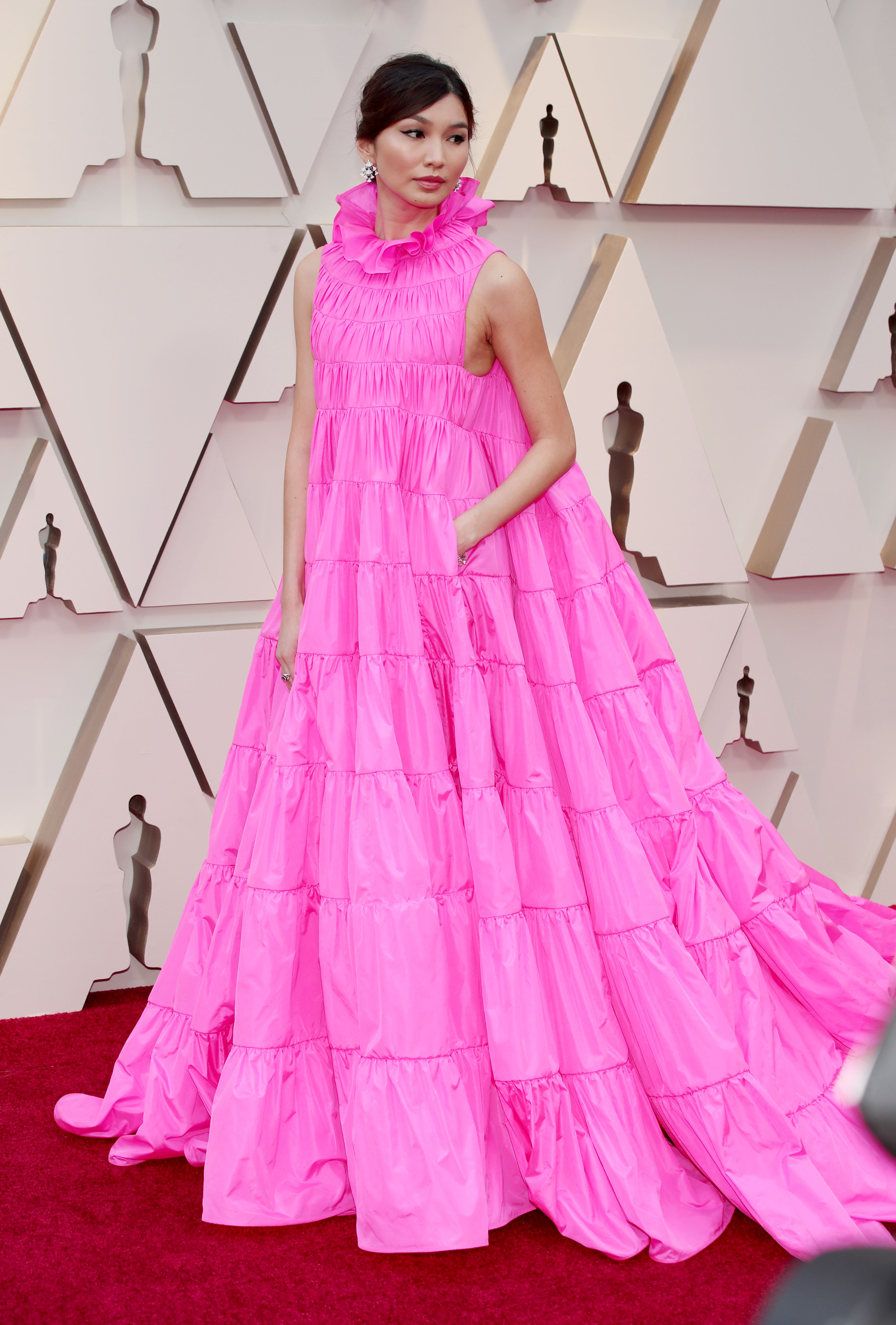 Gemma Chan wore a huge hot pink gown that reminds me of a comforter—in a good way. It also has pockets, y’all.
