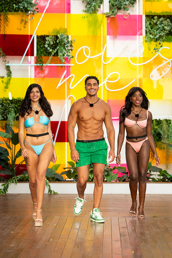 LOVE ISLAND GAMES — Episode 201 — Pictured: (l-r) Nicola Gauci Borda-Warr, Malta; Mert Okatan, Netherlands & Belgium; Garbi Denteh, Netherlands & Belgium — (Photo by: Ben Symons/PEACOCK via Getty Images)