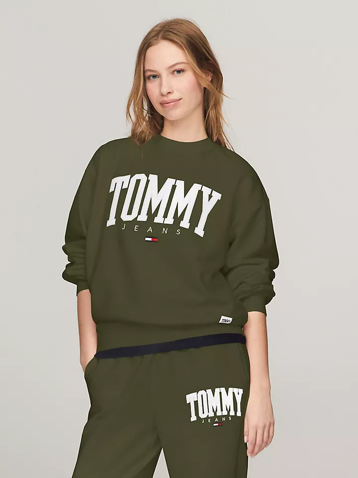 This cozy crewneck has a varsity-inspired Tommy logo displayed across the top and comes in four different neutral shades, including the above army green.