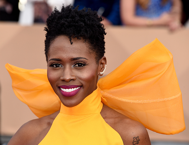 Actress Sola Bamis accented her canary yellow gown with glitter gold eyeliner and bravely added a pop of color with hot pink lipstick. In our opinion, that bold lip made the entire look.