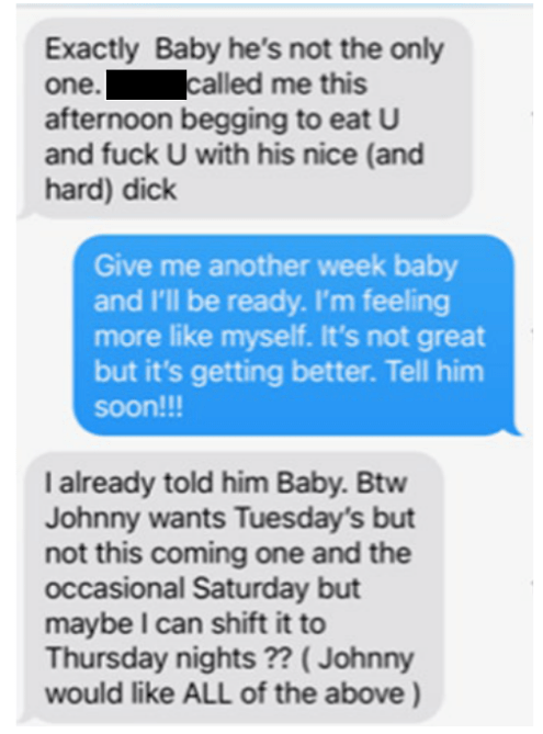 McMahon texted Grant, “Do U promise to make me proud Baby? Will U show him what a Porno Star U can B. Will U Show Off for me like never before ????” and “On days when he’s in town, I want him to fuck U every morning and later In the office too.”
